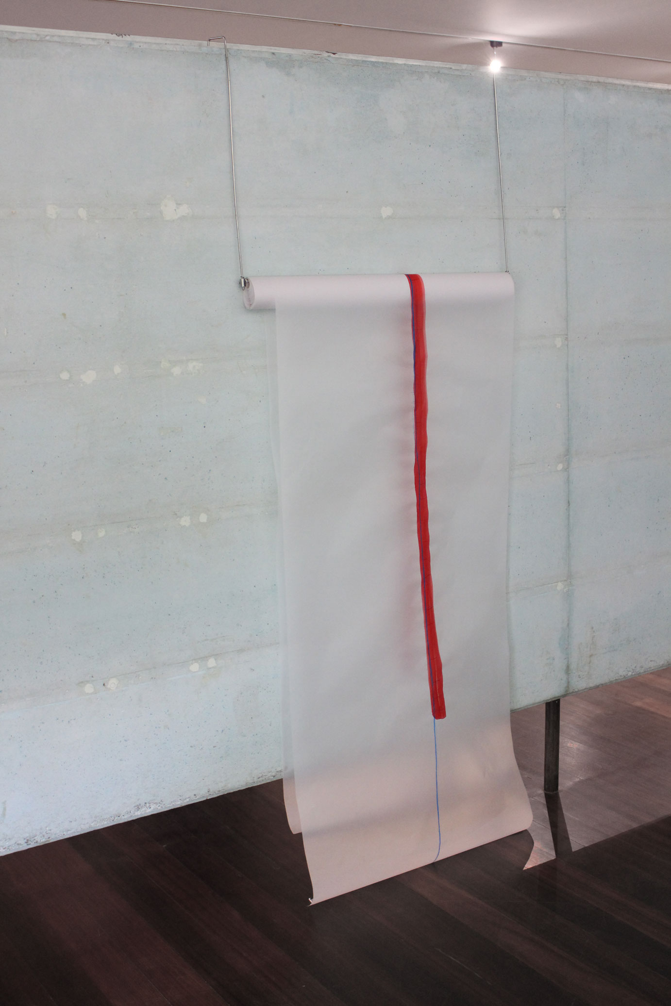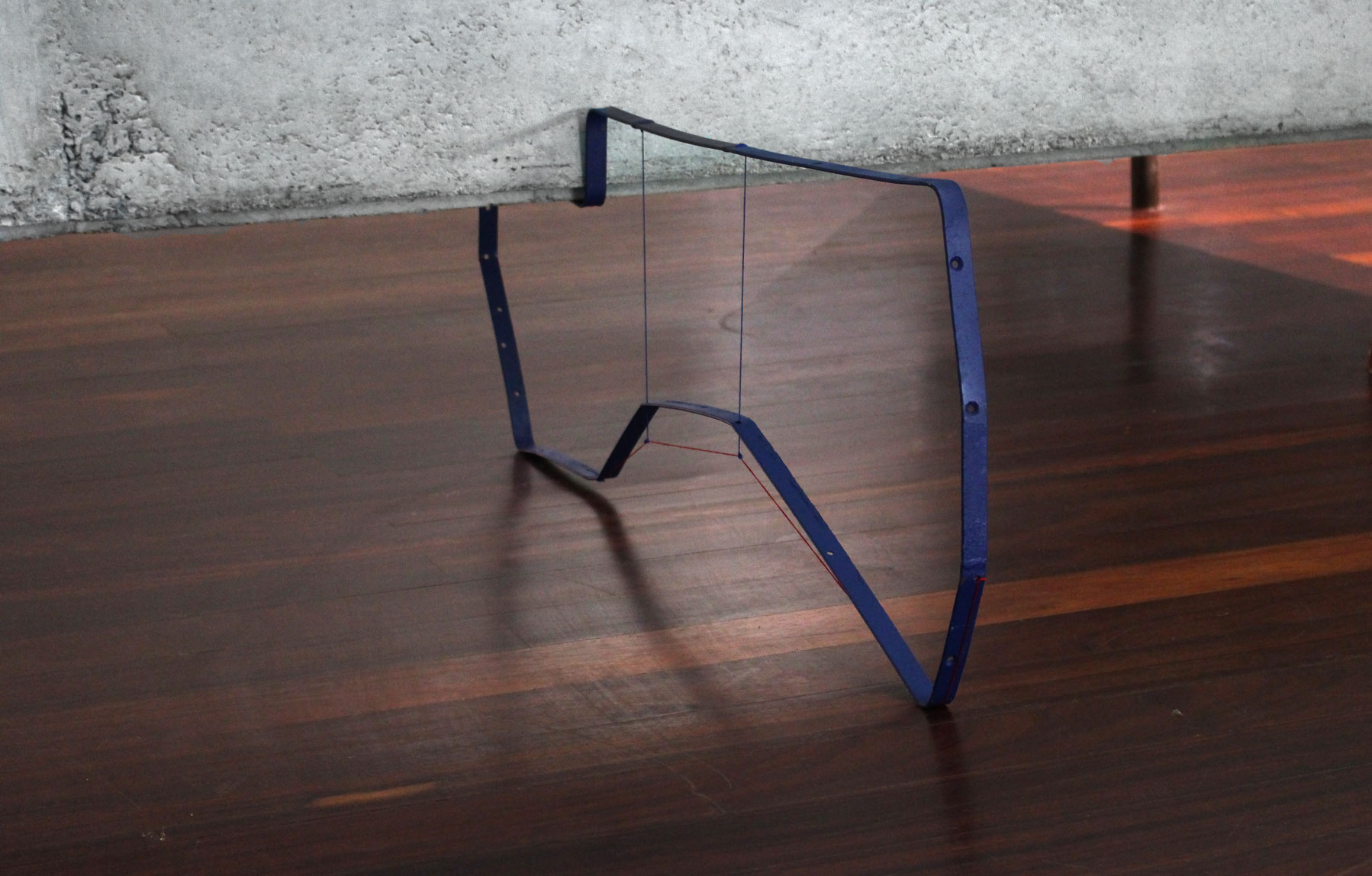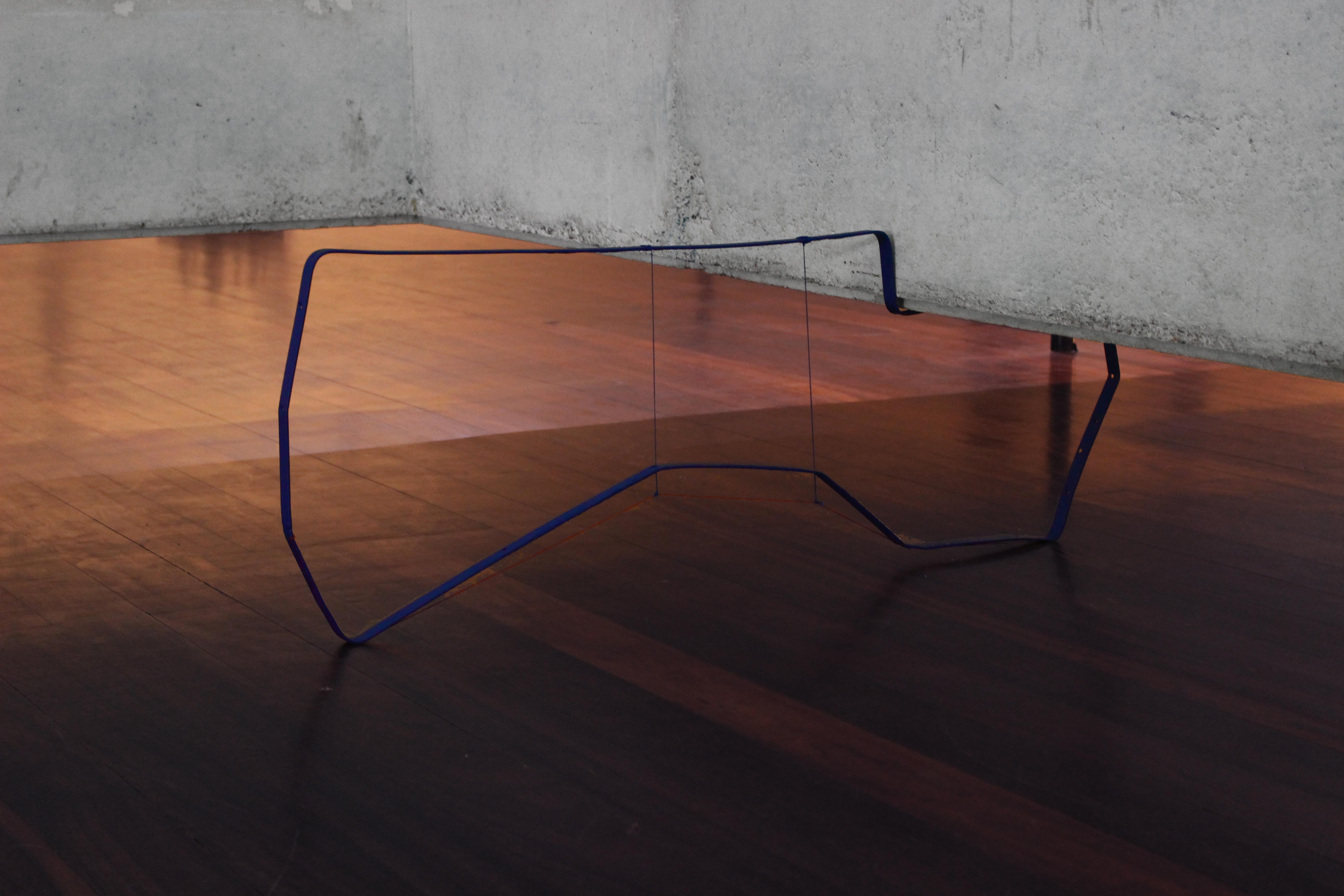 Estrutura metálica azul dobrada sob si mesma, fio vermelho, fio azul.